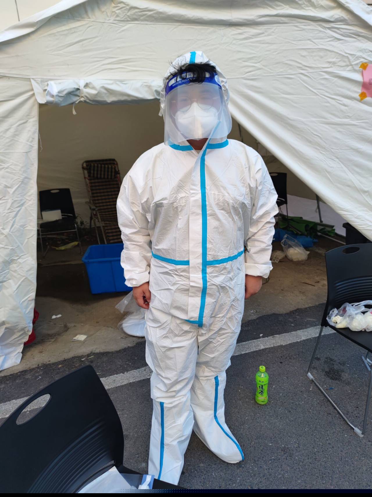 在此期间,目睹那些志愿者在疫情防控一线上挥汗如雨,我深受触动,下定决心要为疫情防控献出自己的一份力量。于是,我光荣的成为了一名志愿者。我深知这不仅是一份责任,更是一份担当,一个属于新时代青年的担当,一个属于南京机电学子的担当。在岗位上,我一天奔波了五个流动检测点,每到一个检测点就要穿戴好隔离服,做好全面的病毒消杀,在每个流动核酸检测点登记黄码和经停机场人员的单独采样信息是我的职责,光是一上午我就登记了整整两百个检测样本,虽然天气炎热,我也没有一丝怨言。