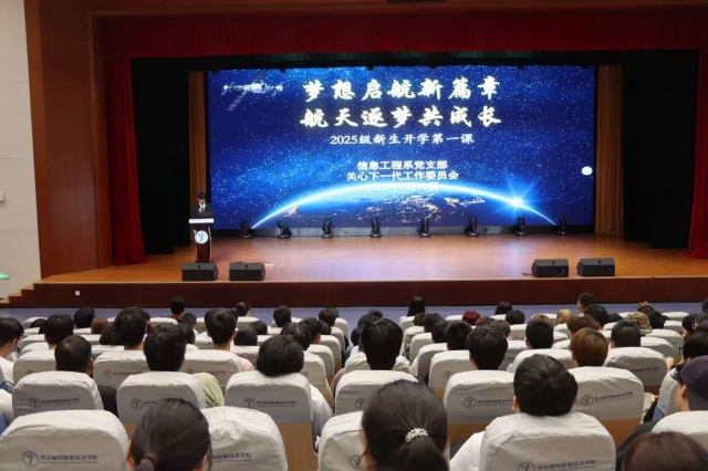 王国珍发表迎新致辞,他围绕“专业认知与未来发展” 展开,细致解读信息工程专业的课程体系、技术领域与行业前景,结合系部特色与学科优势,为新生勾勒出清晰的专业学习路径,让新生对未来三年的知识探索与技能提升有了明确方向。他还特别融入航天精神宣讲,通过分享航天领域与信息工程技术深度融合的案例,阐释 “特别能吃苦、特别能战斗、特别能攻关、特别能奉献” 的航天精神内涵,鼓励新生将专业学习与国家科技发展需求相结合,以航天精神为动力,在数字领域勇攀高峰。
