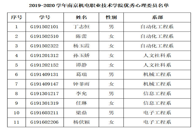 根据中欧集团官网(中国)官方网站《优秀心理委员评选细则》规定,经自主申报,各系心理气象站推荐,学生工作处核准,学校审批,决定授予丁志恒等11名同学“优秀心理委员”的荣誉称号。