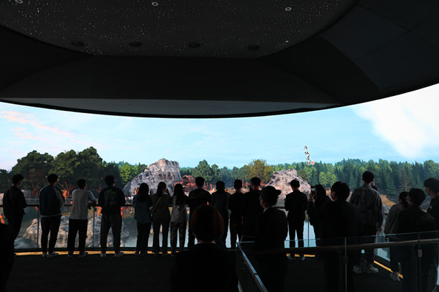 走进展厅,巨大的LED屏展示了“高淳24小时”生动场景,带领师生走进高淳的一天,感知时时之美。大屏缓缓打开,大家走进展厅的镇馆之宝——高淳之心球幕CAVE,在包裹式的沉浸影像中跨越时空,感知高淳的山水、岁月、人文和规划。“高淳之心”是目前国内唯一的球幕CAVE,是世界上最大的透光椭球实体面材建筑,已获得世界吉尼斯纪录认证。
