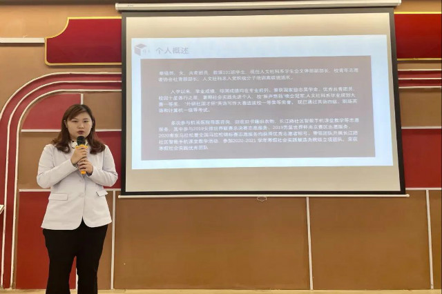 分享会伊始,主讲人秦翛然同学结合自我志愿活动经历以及思想感悟。鼓励同学们积极学习优秀先进,提升自我能力;能够通过多方交流调查并结合实事,确定真正有意义的志愿活动内容;号召更多的同学们积极参加志愿活动。结合实事、从实际出发,将志愿服务精神延续下去。最后她希望同学们遇到困难要努力克服坚持下去,丰富技能提升学识开阔眼界,更加具有热情与热血不怕苦不怕累、不骄不躁、冷静处理问题。