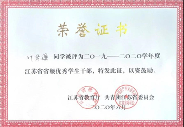 入学以来获得国家奖学金、国家励志奖学金、江苏省省级优秀学生干部、江苏省暑期文化三下乡社会实践优秀团队、南京市优秀社会实践团队、防控疫情先进个人、院三好学生、院优秀学生干部、院优秀共青团员、院管理之星、院优秀标兵、院优秀社会实践团队、优秀社会实践个人等荣誉。申请国家实用新型专利六项,已授权专利四项。学习成绩在系部专业排名第一,综合素质排名第一。