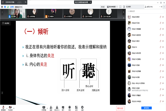 南京航空航天大学陈瑜老师从朋辈辅导员的基本要求、职责定位、朋辈心理辅导的实质和工作技巧等方面展开详细解说。朋辈心理辅导对于大学生的自助或互助尤为重要,掌握沟通技巧做到真诚陪伴,共赴未来。