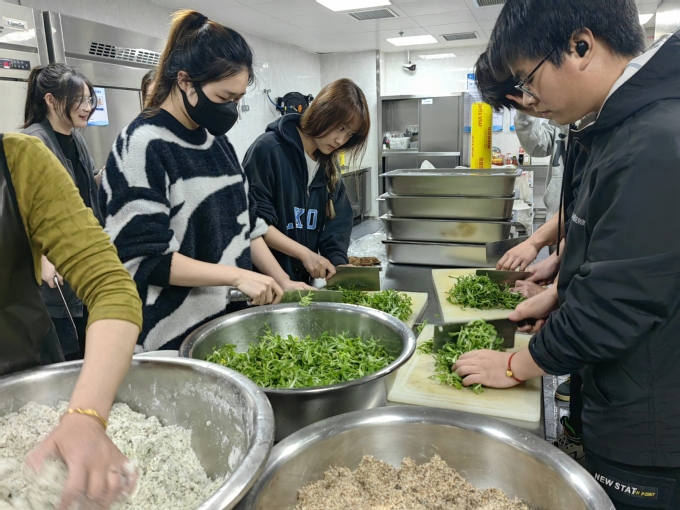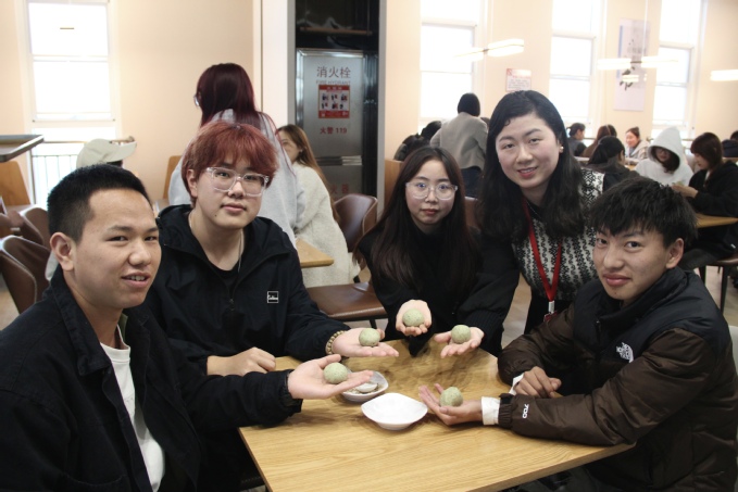 党委委员、工会主席姜振宇、学生工作处处长张宝中、大学生生活服务与管理中心主任张进宝、大学生资助管理中心主任钱莉娇参加活动,和同学们一起做青团、话清明,亲切交流,现场氛围轻松愉快。同学们将草绿色的面团,揪成一个个小块,将块状的面团压扁,挖一勺豆沙、芝麻等口味的馅料,再捏拢收口,搓成圆球......不一会儿,一个个碧油油的青团就完成了。不少同学们充分发挥想象力,包出形态各异的特色青团,大家看着自己亲手打造的“作品”,愉悦的心情都写在了脸上。
