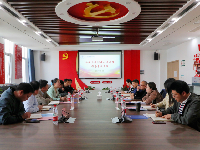 4月12日,正德职业技术学院副院长梁薇一行来校调研交流。校党委委员、副院长赵学洪,党委委员、工会主席姜振宇出席调研座谈会。