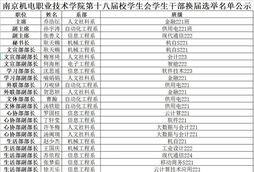 以上名单为2023年6月第十八届校学生会学生干部换届选举名单,特此公示。