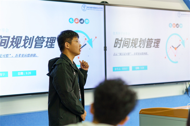 蒋翔宇同学从亲身经历出发,以时间管理规划为主题,分四个方面进行相关分享。在如何有效规划时间方面,蒋翔宇向同学们强调时间管理的重要性,提醒同学们高效率地利用时间必须认识到自己要成为时间的主人,在时间管理步骤方面,蒋翔宇分享自己对一件事情的分解、分配、任务的复盘以及任务的调整;在时间管理效能方面,他告诉我们要找到自己的目标,明确自己努力的方向,保证自己在正确的目标上不断挑战,持续跟进;在时间管理效率方面,他表示设置优先级将任务按重要性和紧急性分类,做到及时处理,制定明确的目标和计划,确保自己每天都能保持。