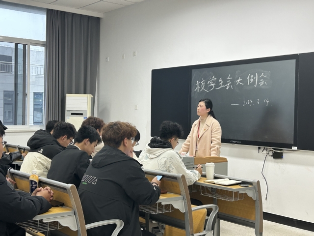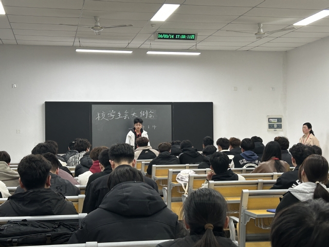 校学生会指导老师钱莉娇指导讲话。她对新学期学生会提出三点希望:一是要强能力,二是要锻作风,三是要抓落实,要以更加饱满的热情投入到新学期工作中,投身到为同学办实事中,为学校高质量发展贡献青春力量。