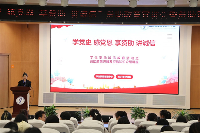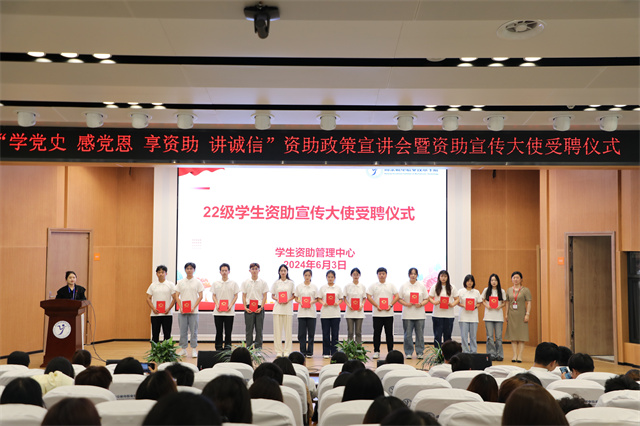 为全面贯彻落实党的二十大精神,落实学校关工委工作要求,广泛宣传落实国家资助政策,进一步推进发展型资助育人工作,加强学生资助宣传大使团队建设和培养,做好学生的诚信教育和励志教育,2024年6月3日晚,学生工作处学生资助管理中心在乐学楼报告厅开展资助政策宣讲会暨学生资助大使受聘仪式。全体学生资助宣传大使、生源地信用助学贷款借贷学生参加活动。活动由学生资助中心朱丹丹老师主持。