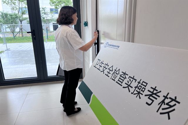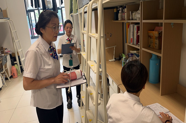“快速识人”环节,宿管老师对所负责的楼层同学进⾏快速识别,根据20张学生照片判断,识别率需达到60%合格。这不仅考验了宿管老师的记忆力和观察力,更展现她们扎实的业务技能功底。“卫生安全检查”“外来访客登记”环节,在博雅苑101宿舍现场模拟宿舍管理中的常见问题,考查宿管老师实际操作技能。宿管老师根据“7S”管理要求与内容,熟练地进行卫生安全检查;面对外来访客,展示了规范的操作流程,仔细询问和登记,确保校园的安全和秩序。