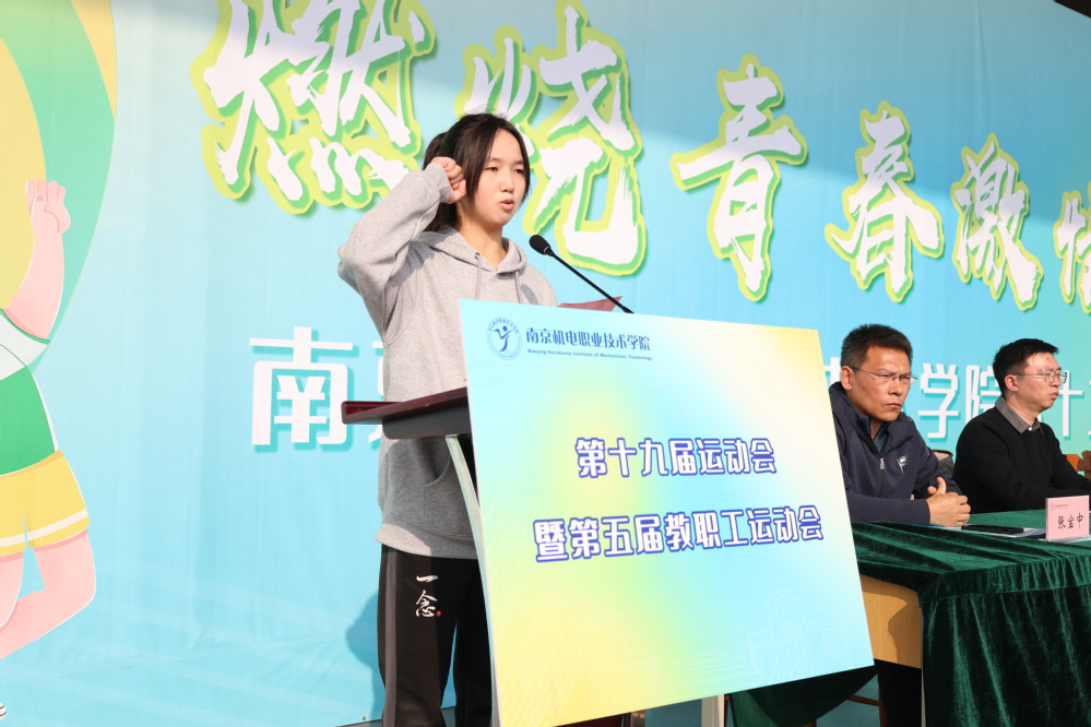 电气自动化231班马天鹰代表全体运动员庄严宣誓,在比赛中遵守规则,尊重裁判,尊重对手,服从安排,以饱满的精神和积极向上的态度完成各项比赛;人文社科系体育部陈文继代表全体裁判员庄严宣誓,将严格遵守裁判员纪律和各项竞赛规则,文明裁判,做到公平、公正、公开并准确评判每一项比赛成绩,确保比赛顺利进行。机械制造及自动化241班刘轩代表全体志愿者郑重宣誓,将以饱满的热情,和认真的态度投入运动会志愿服务中。以高度的责任心,认真对待每一项任务。以实际行动,践行志愿精神!
