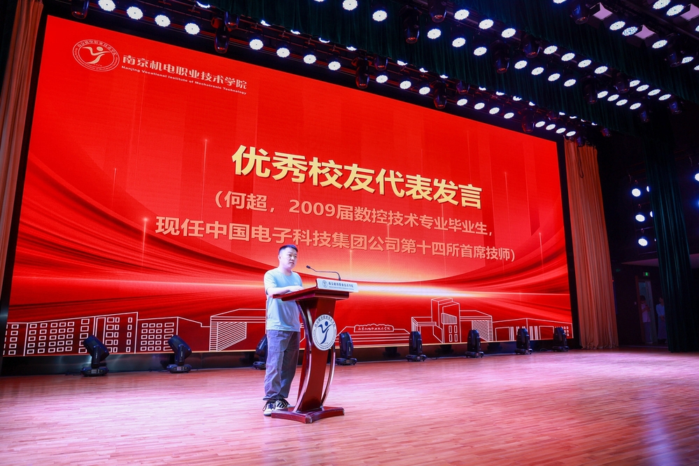 学校特别邀请2009届数控技术专业毕业生、中国电子科技集团公司第十四所首席技师何超作为优秀校友代表发言。他从扎根、突破、传承三个方面分享励志成长故事,讲述他从学校技能竞赛走向全国数控技能大赛获奖的奋斗经历。希望学弟学妹们以扎实的技能为笔,以创新的思维为墨,在中国制造向中国创造的征程中,书写属于自己的精彩篇章。
