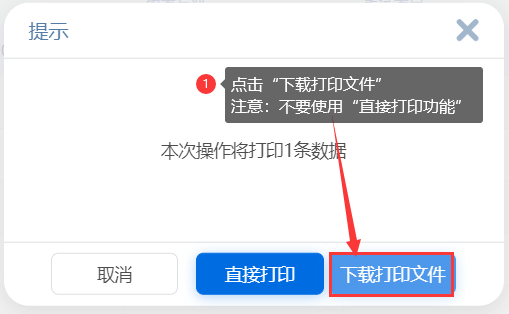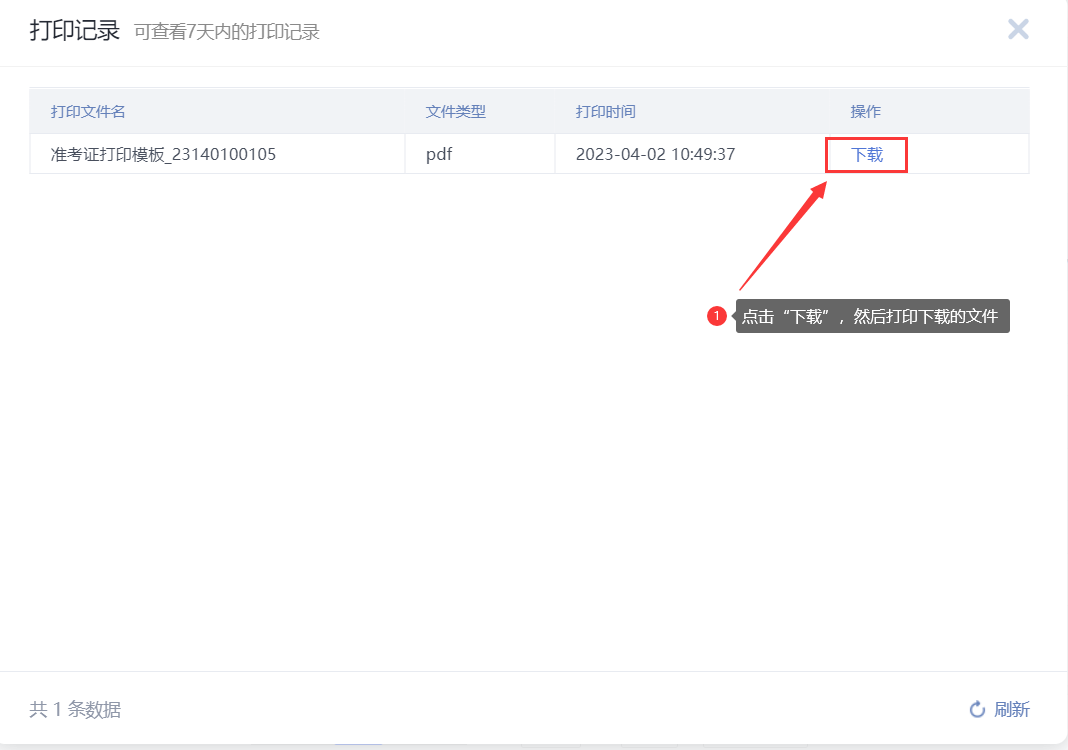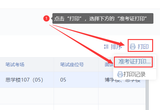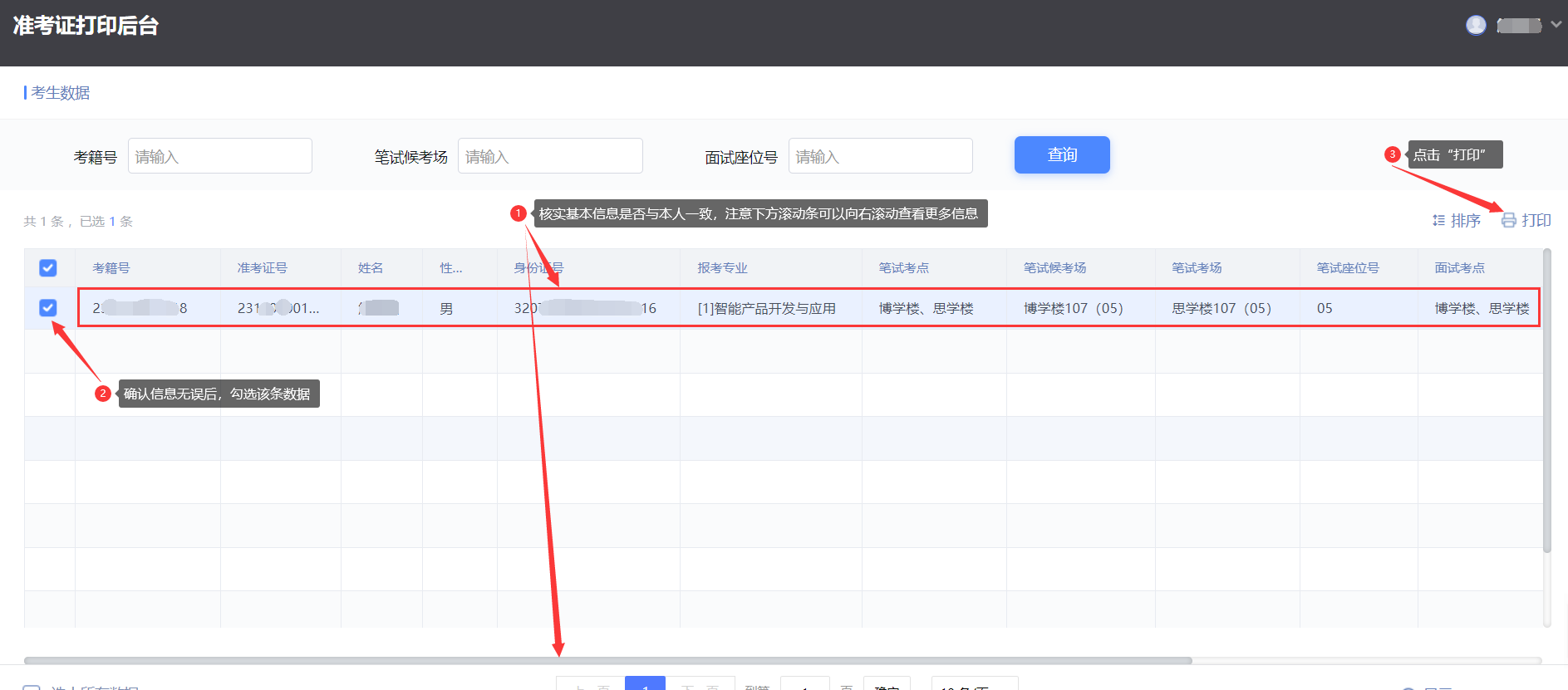 二、登录系统后:①核实基本信息是否与考生本人一致,若有误则联系学校;②确认信息无误,勾选此条数据信息;③点击“打印”