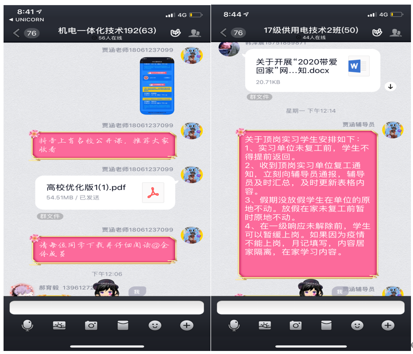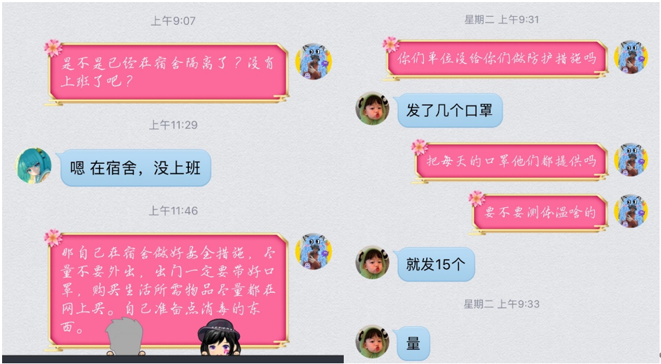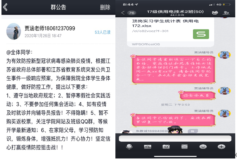 我所带的四个班级中,有2个班级正在顶岗实习期间,这些孩子中,有一些过年期间还依旧坚持在自己的岗位上,我在第一时间内了解了疫情期间还在岗的学生。针对这些学生,在班级群中每日利用在线文档填报自己的身体健康状况,安抚他们的情绪,关注心理状态;尤其是没有回家过年期间还在单位的的学生,每天亲自点对点进行沟通,确保他们做好防护措施,并且提醒他们在宿舍自我隔离。