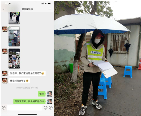 因疫情影响,学院延迟开学时间,辅导员刘鹏担心学生在家的健康问题,与家长逐一联系。在与家长沟通中发现,供用电181班学习委员姚雨龙同学,自2月12日起,就自愿加入防疫志愿者的团队中来,在自己的老家浙江海宁斜桥祝东村,与村委会的同志一起做好防疫工作,给进出的村民测量体温,排查外来人员的基本信息并做好登记。在当志愿者期间,也不忘自己还有学校的网络课程的学习,能够合理安排工作和学习的时间,认真积极上课,按时将课程作业交给老师。家长说,非常感谢学院与老师对学生的关心,作为家长也会好好督促学生的线上课程学习。