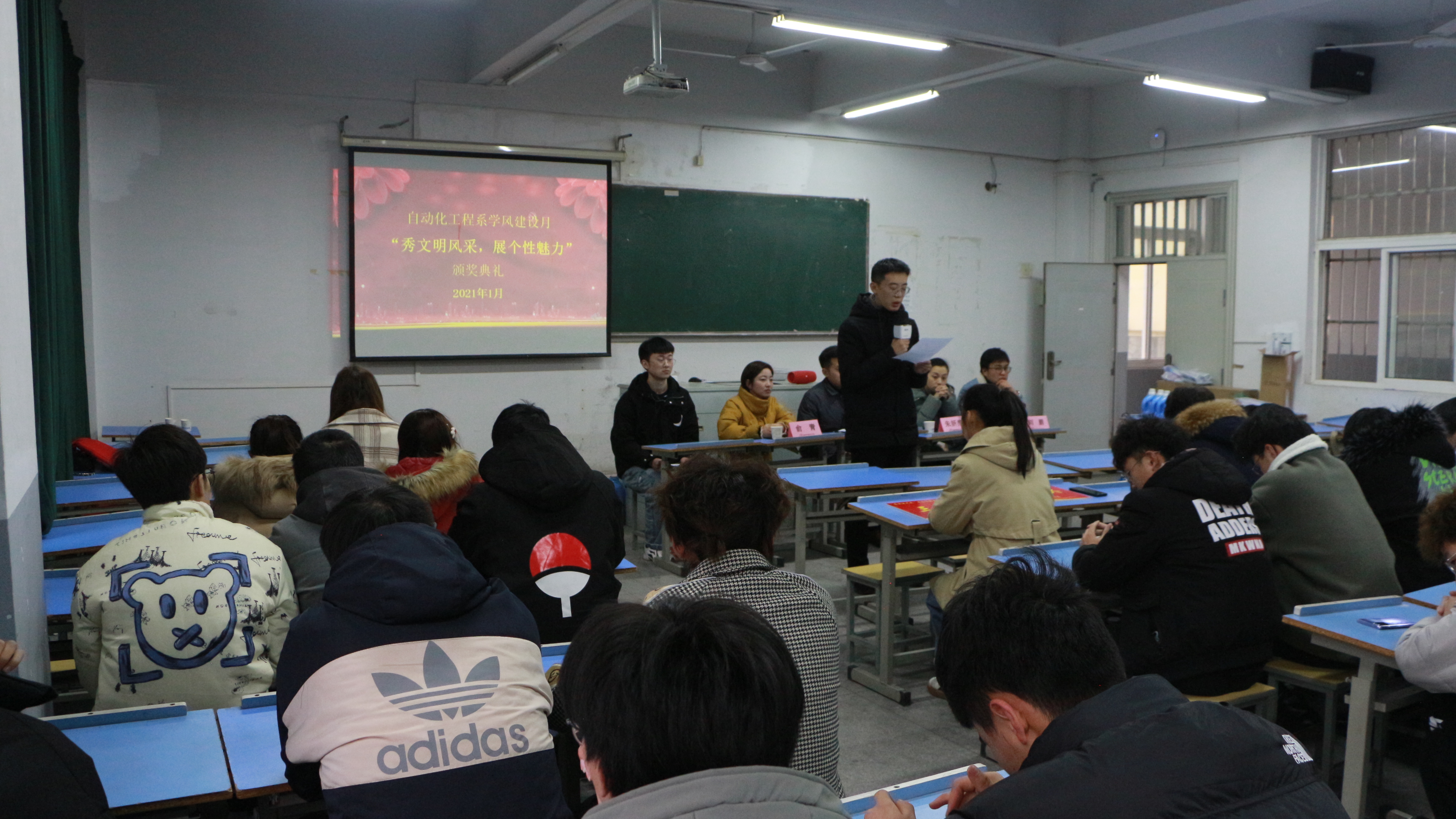 为营造良好的宿舍文化氛围,提高学生的学习积极性,自动化工程系于2020年11月举办了宿舍文化建设月主题活动。活动期间,系部同学积极响应,涌现出许多优秀宿舍。为此,1月5日下午四点在知行楼511,我系举办了颁奖典礼,出席颁奖典礼的有自动化工程系高水冕书记、学生会指导老师朱妍焘老师、辅导员刘鹏老师和俞青老师以及获奖宿舍。