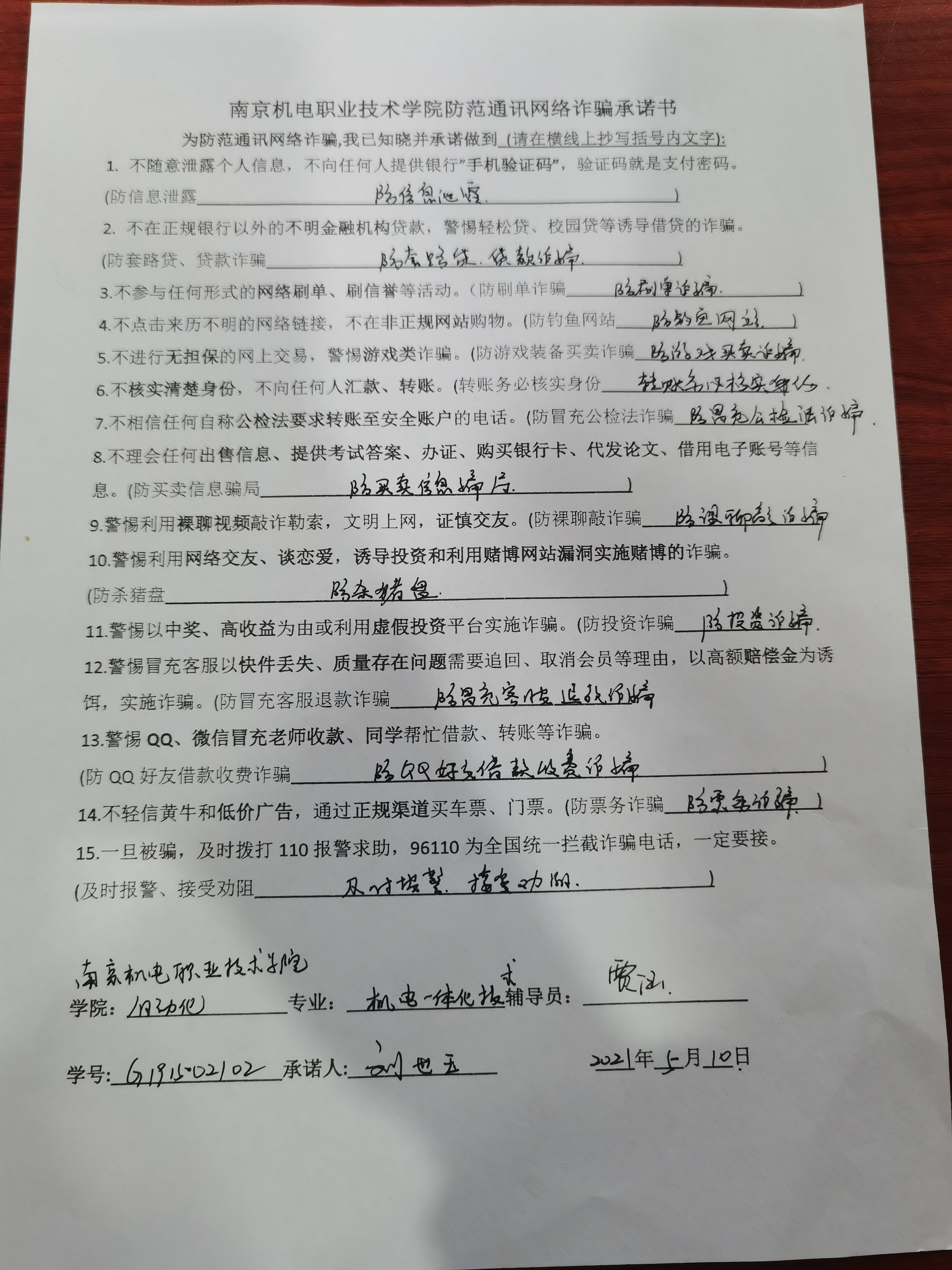 近年来,电信网络诈骗现象层出不穷,为进一步扩大防范通讯网络诈骗宣传覆盖面,了解通讯网络诈骗手法,提高校园师生防骗意识及防范能力。自动化工程系在2021年5月各班级陆续开展了防范通讯网络诈骗知识的宣传教育,普及防范通讯网络诈骗知识的同时提升大家的防骗意识。为确保每位同学认真学习并了解相关内容,系部印发了“防范通讯网络诈骗承诺书”,组织以班级为单位下发至每位同学手中,由班长带领学习后进行签名.