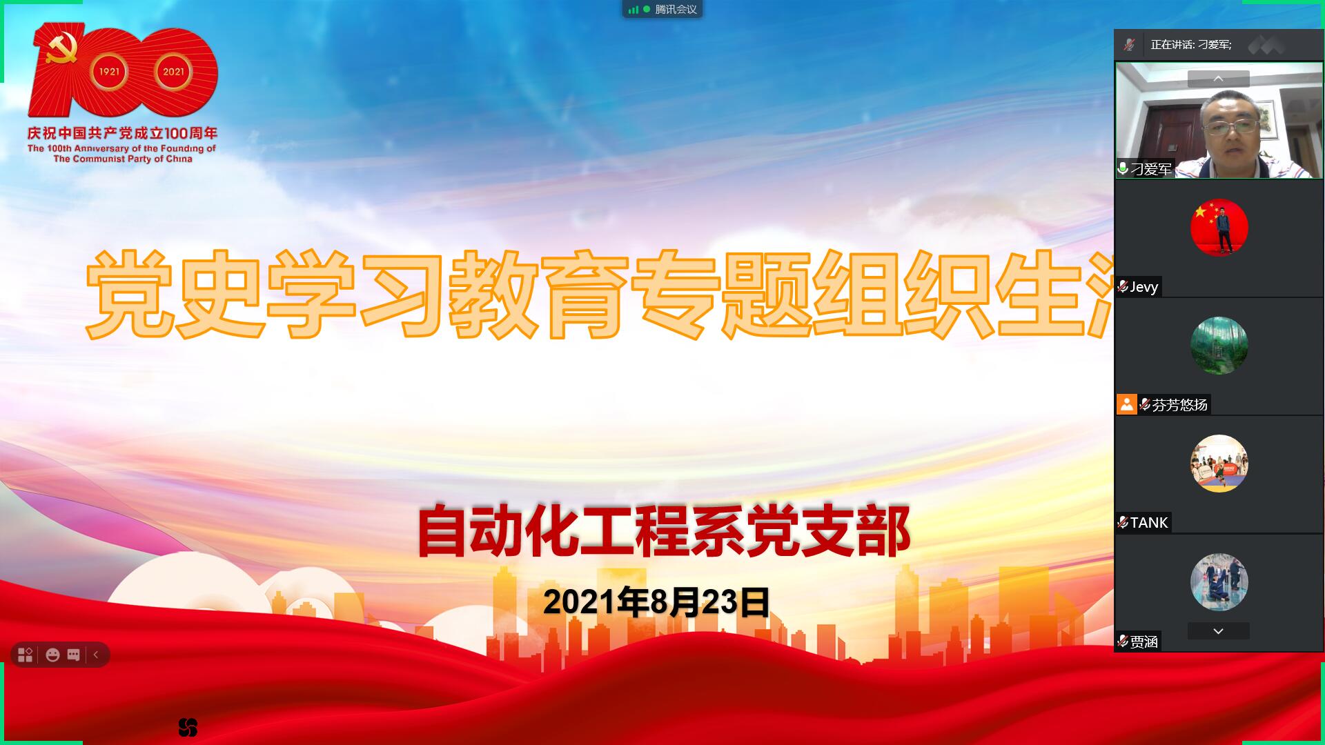 根据《南京机电产业集团关于召开党史学习教育专题组织生活会有关事项的通知》的精神,8月23日,我系党支部线上召开党史学习教育专题组织生活会,会议由党支部副书记高水冕主持,学校党委委员、副院长刁爱军莅临指导,自动化工程系主任潘理平以及系部全体党员参加本次会议。