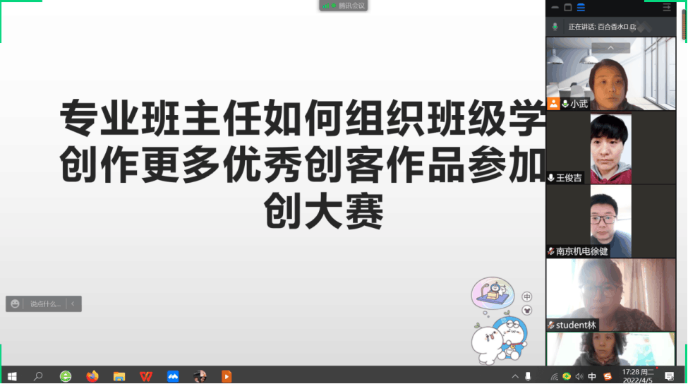 在国家创新教育的大背景下,为充分调动学生参与创客校园建设的热情,4月5日下午,供用电技术教研室全体教师在腾讯会议上开展专业班主任创新工作经验分享交流会。