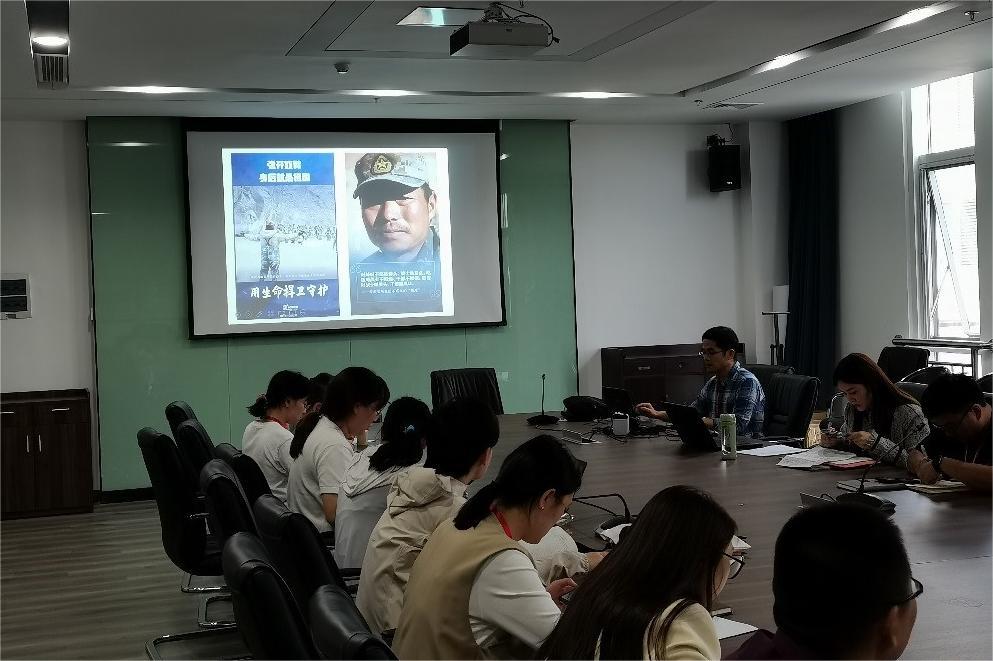 林敏老师带领支部全体教师学习了卫国戍边的英雄团长——祁发宝的优秀事迹。林敏老师分别从祁发宝团长的成长经历、主要事迹两个方面进行讲解。爱军精武,善于战术指挥的祁发宝,被评为优等指挥员,所带连队被评为军事训练一级单位、标兵连队。他个人曾获兰州军区戍边先进个人、新疆军区优秀基层主官等奖项,荣立二等功 1 次、三等功 5次。2020年6月,外军公然违背与我方达成的共识,越线搭设帐篷。祁团长组织官兵占据有利地形,与数倍于己的外军对峙。对方用钢管、棍棒、石块发起攻击,祁发宝成为重点攻击目标,头部遭到重创,但是,祁团长带领大家一直坚持到增援队伍赶到。