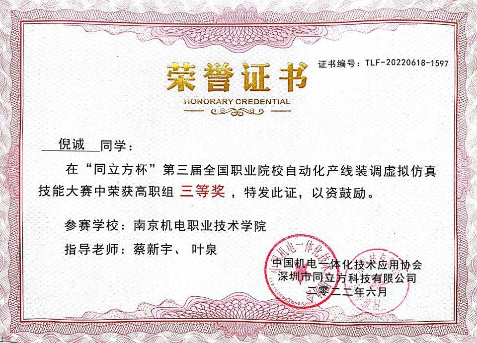 由中国机电一体化技术应用协会主办,深圳市同立方科技有限公司承办的2022年“同立方杯”第三届全国职业院校自动化产线装调虚拟仿真技能大赛于6月18日在线上举行,机器人系统集成竞赛团队积极备赛,竞赛团队成员徐涛、倪诚、支崇炫取得三等奖的成绩
