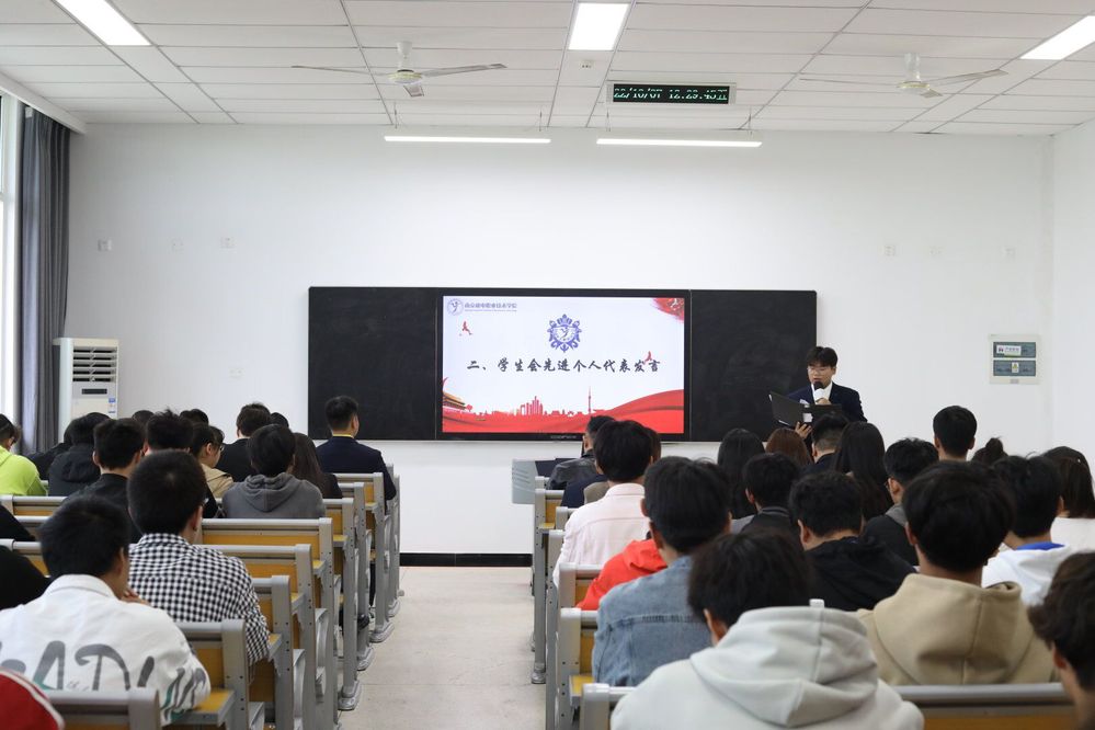 首先是对新干事进行授牌。随后,学生会先进个人代表宋家辉同学进行发言,他从自己上个学年的学生会工作中,总结整理出来了很多经验,并且将所总结的经验分享给了学生会的新成员,鼓励他们努力学习,做好每一件事。