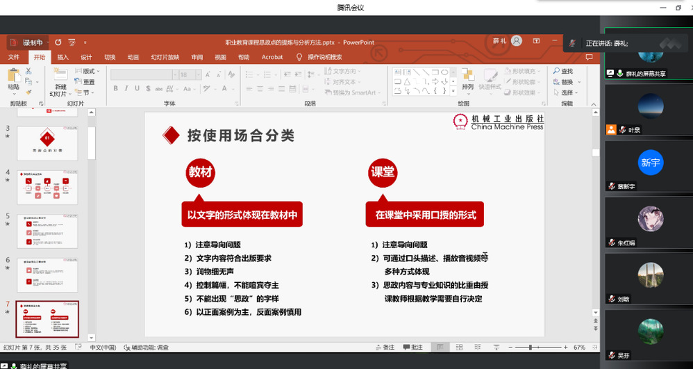薛礼主任审首先从思政点的分类、挖掘提炼思政点的角度以及典型思政案例等方面进行分析,以从业人员的角度详细地为与会教师讲解了课程思政在教学设计中的注意事项。在分享中薛礼副编审提出,教师在日常教学和教材编写中,应当以品德修养、科学精神、职业素养、核心价值观、职业素养等方面为落脚点,以事实举例、从知识延伸,综合分析进行课程思政点提炼。