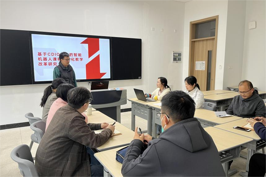 会议开始,杨俊老师首先向各位老师汇报了上学期项目化教学改革的研究成果。杨俊老师围绕CDIO理念和创客教育理念,以智能机器人安装与调试课程作为改革课程,主要从改革理念、设计方案、实践内容和建设成效四个方面展开讲述。CDIO理念以企业中的项目发展周期作为依托,让学生完整地参与到整个项目流程中,实现教、学、做一体化,通过实践证明,基于CDIO理念的教学模式能够很好地培养学生的团队合作能力、动手实践能力和思维创新能力。