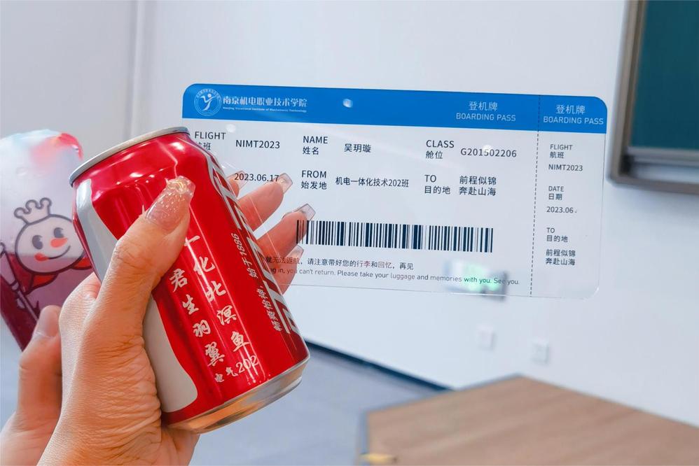 辅导员贾涵两周前就开始策划毕业礼物,给毕业生们精心准备了印有班级名称和毕业祝福的可乐,同时给每位同学都准备了一份毕业机票,祝福他们前程似锦,奔向更加美好的未来!