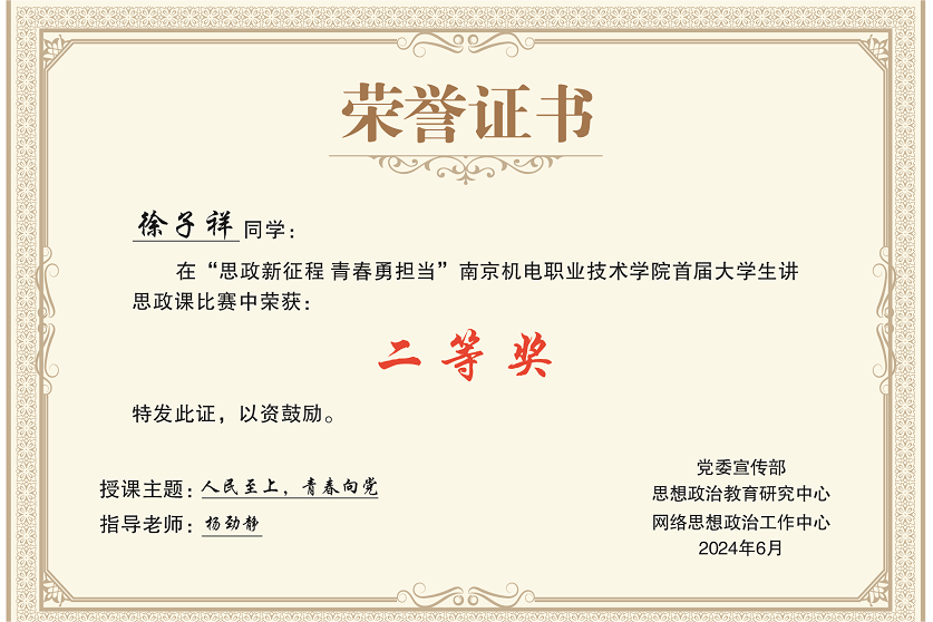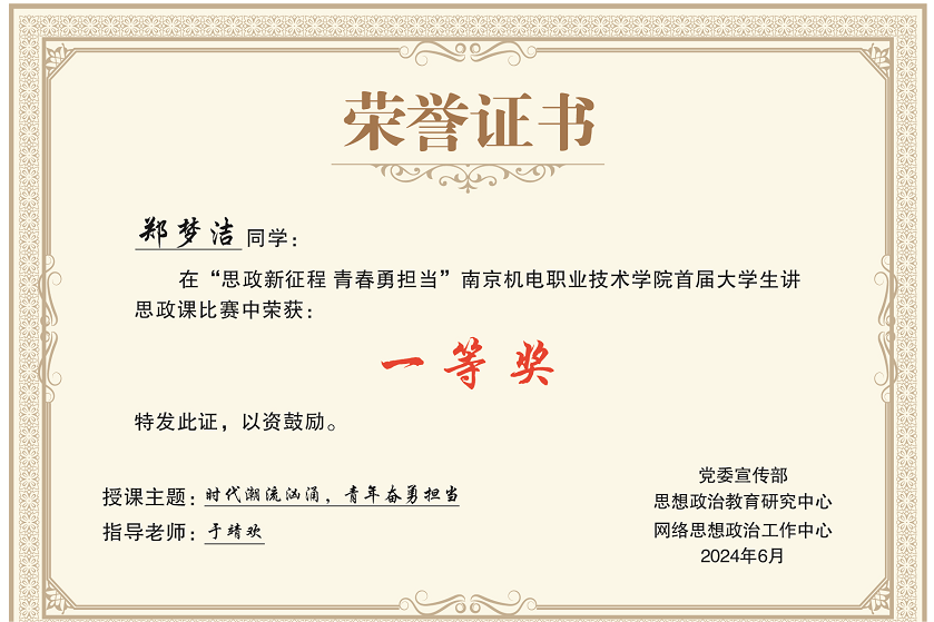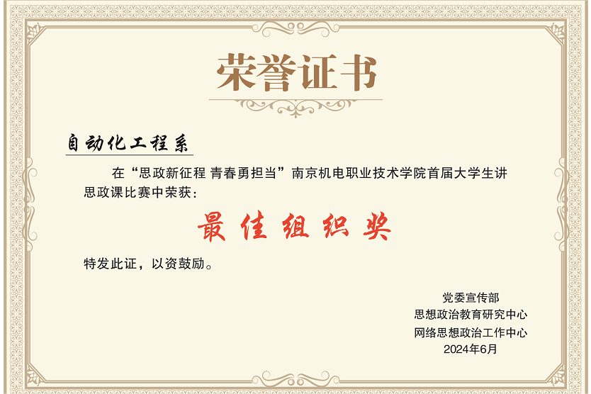 2024年6月18日,中欧集团官网(中国)官方网站首届大学生讲思政课比赛圆满落下帷幕,自动化工程系荣获最佳组织奖,郑梦洁(指导教师:于靖欢)荣获一等奖,徐子祥(指导教师:杨劲静)荣获二等奖。