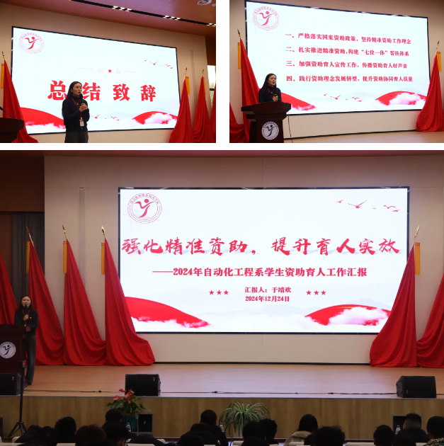 活动最后,系部资助工作负责教师于靖欢对2024年度学生资助工作做了总结汇报。于老师分别从严格落实国家资助政策,坚持精准资助工作理念;扎实推进精准资助,构建“七位一体”帮扶体系;加强资助育人宣传工作,传播资助育人好声音;践行资助理念发展转型,提升资助协同育人质量四个方面对系部学生资助工作进行了汇报。